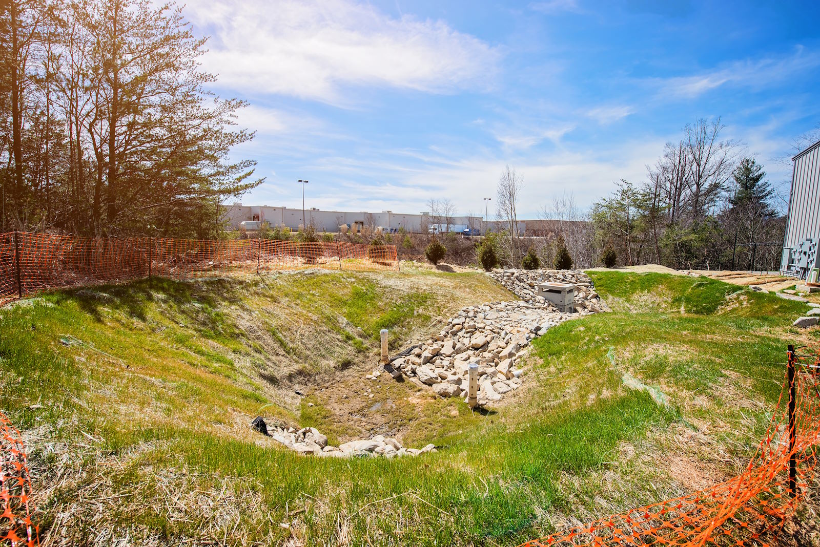 Clearing, grading, storm drainage, and underground water, sewer, power, and data pathways installed.